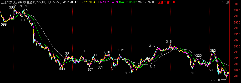 根据缠论分析,在5分走势之后,市场进入了盘整背驰阶段,而在这个阶段内,1分走势同样进入了盘整背驰。在这种双重背驰的现象中,若不加快下跌速度,反弹可能即将出现。观察常见的30至60分指标,已经出现了底背离现象,且在2873点附近的年线位置,市场具有一定的支撑力。以往类似情况下,市场都出现了不同程度的反弹。这些技术指标对于判断市场趋势具有一定的参考价值。