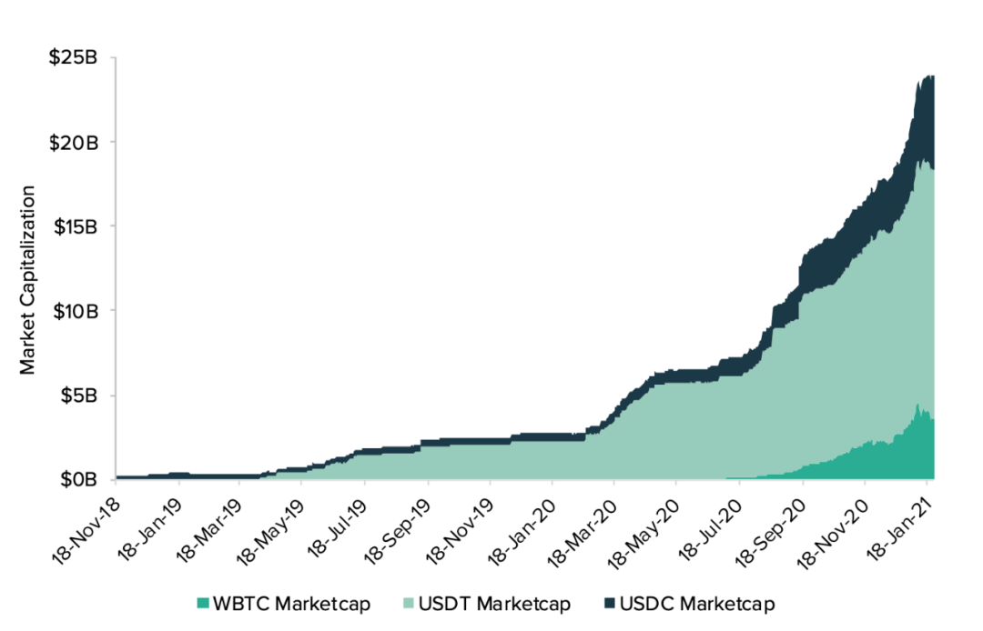 不过在货币竞争的领域里,它面临着挑战。如果投资者将 ETH 当作货币,那就需要对它与其他货币竞争对手的价值进行对比。稳定币以及比特币在 ETH 抵押的场景中使用不断增多,有可能使 ETH 作为生态中首选抵押品的地位发生改变,这种竞争将会对其货币价值的走向带来影响。