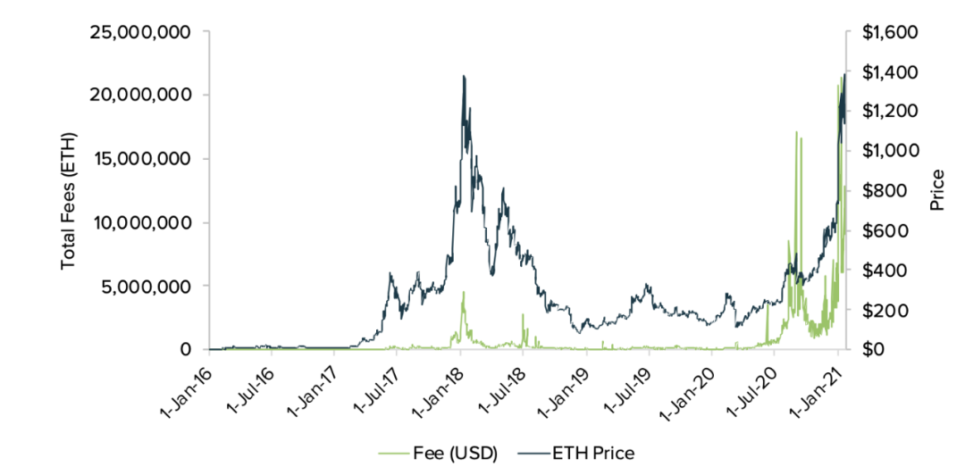 衡量 ETH 需求有一个实用指标,即观察以太坊网络每天收取的总交易费。若交易费较高,就表明对 ETH 的需求较大。对该数据进行分析,可洞察市场对 ETH 的接受程度以及使用频率。