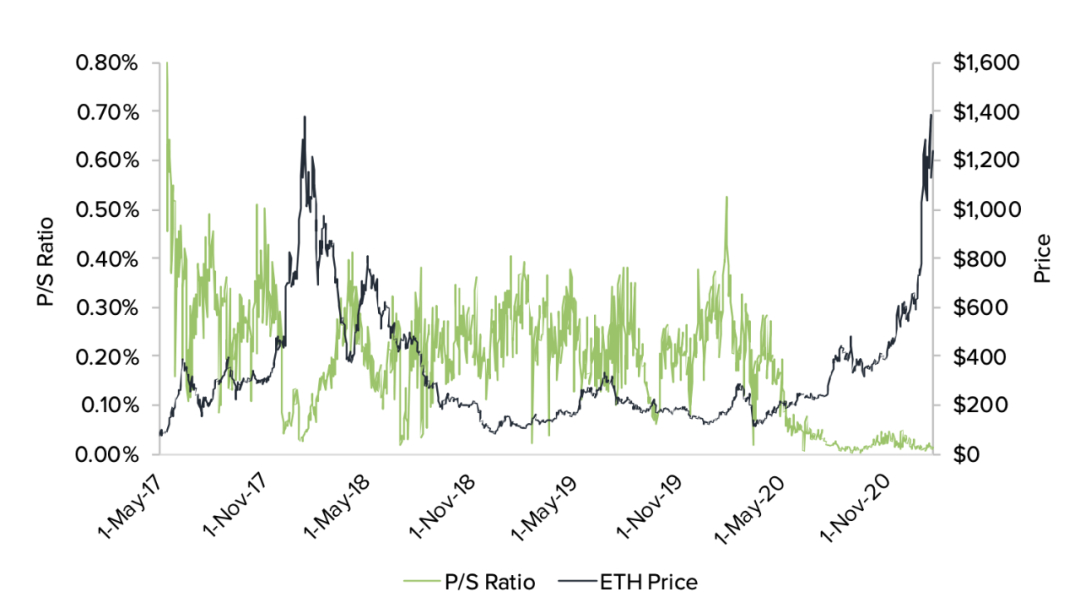 另外,在比较 ETH 的历史价格和网络销售(费用)时,“价格与销售额”这个比率是很重要的。比率低表明网络相对 ETH 的历史市值能够产生较高的收入,这给投资者了解 ETH 的价值提供了有价值的参考。