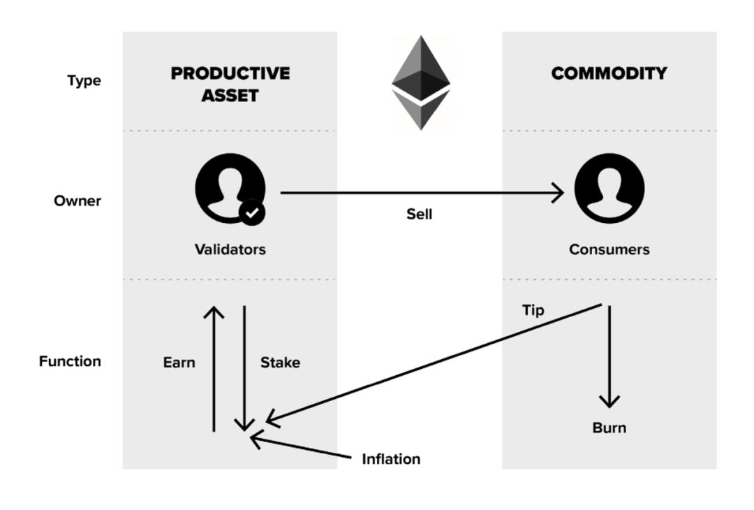 以太坊 2.0 赋予了 ETH 一些新的特质。ETH 从原先的普通商品变成了生产性商品。ETH 的持有者能够把自己的 ETH 当作抵押品,接着就可以成为网络验证者,通过抵押来获得利息收益。