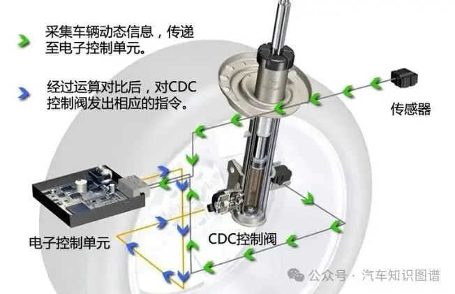 CDC系统构造较为复杂,它由电子控制模块、减震装置以及车身加速度感应器等部分组成。若想深入掌握CDC系统,首先需要对汽车减震的基础知识有所了解。汽车减震是通过减震弹簧和减震装置共同作用来实现的,其中减震装置的阻尼性能决定了悬架的软硬程度。只要能够调节阻尼,就可以随意调整悬架的软硬。
